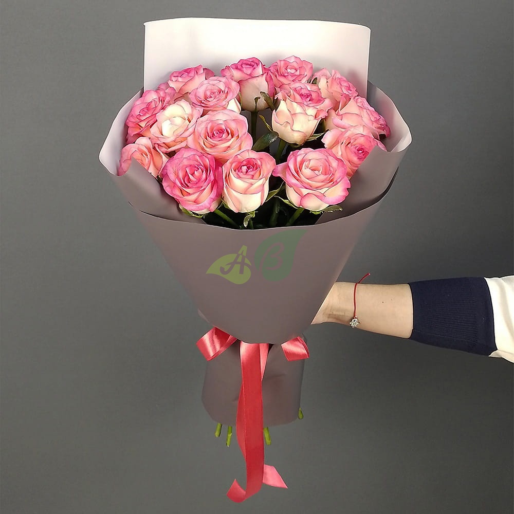 • Роза - 15 штук, цвет - бело-розовый, длина стебля - 60 см;